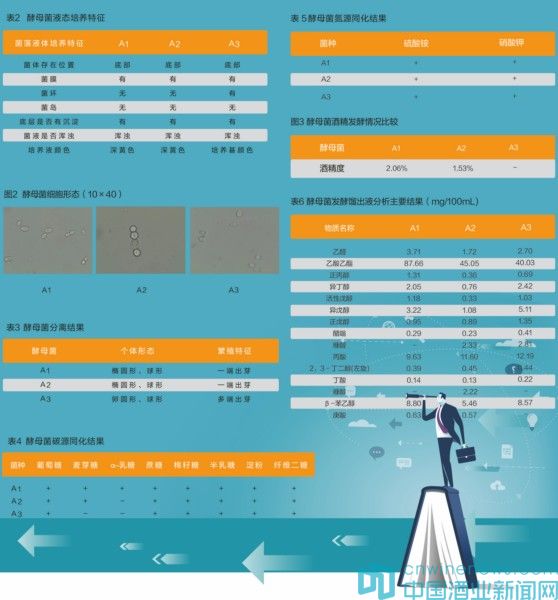 由表可見,酵母菌A1酒精合成能力最強,其次為酵母菌A2,而酵母菌A3的發(fā)酵液中沒有檢測到酒精。由此可見同樣是來自于酒醅中酵母菌,其對白酒產(chǎn)質(zhì)量的影響是不同的,如何提高出酒率,提高優(yōu)質(zhì)品率,還需要對酒醅中的酵母風味物質(zhì)代謝進行深入研究。