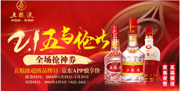2016年1月25日,京東與五糧液強強聯合,在手機京東開啟酒類品類的首個“超級品牌日”,五糧液成為京東酒類首個合作的超級品牌。從1月25日到31日,五糧液超級品牌日將聯合手機京東超市等核心資源進行預熱,2月1日盛大啟動,以正品保障+超值回饋+京東物流與服務,為消費者提供一站式購買便利。