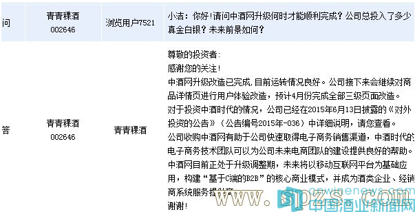 周五青青稞酒(002646,股吧)(002646)在全景網(wǎng)互動平臺上表示,中酒網(wǎng)升級改造已完成,目前運(yùn)轉(zhuǎn)情況良好。