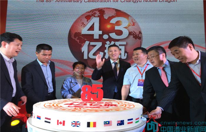 為了慶祝張裕解百納85周年,張裕特意訂做了一個直徑為85厘米的巨型蛋糕,蛋糕的四周“圍”上了28面不同國家的國旗,代表著張裕解百納出口的28個國家。