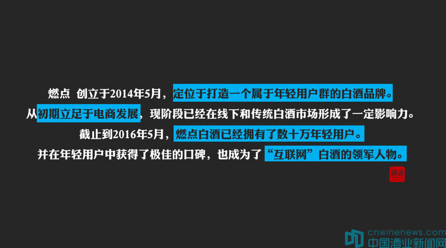 我們要做一個屬于年輕人的白酒品牌,2014年開始做電商,去年開始做線下嘗試,今年開始做定制。截至今年5月份,我們把燃點白酒賣給幾十萬的年輕用戶群,并且得到很好的反饋,產品也變得越來越豐富。