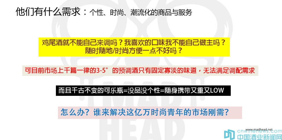 2011年我們開始做酒,2012年,我們又決定在雞尾酒市場分一杯羹,但我們決定發揮差異化的競爭優勢,在雞尾酒細分市場上主打自調雞尾酒的概念,針對目標是年輕消費者開發一些特別的、別致的雞尾酒。所以我們打造了國內第一款的潮牌利口酒。
