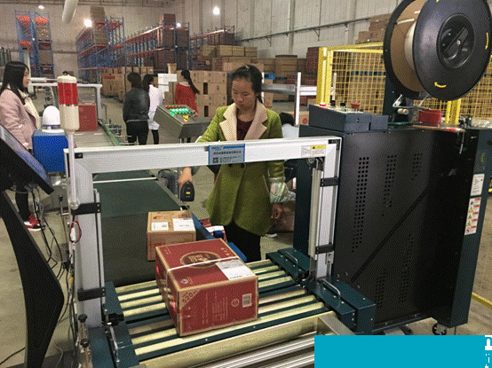 工作人員在打包臺前熟悉設(shè)備,一人手拿掃描儀,對準(zhǔn)包裝盒上二維碼一掃,對面屏幕上立馬顯示重量,并發(fā)出指令“發(fā)貨”,貨物流向前端自動打包機,打包帶瞬間捆好。