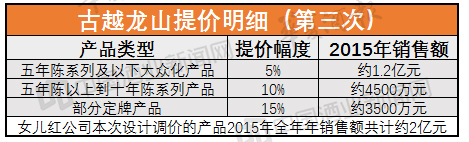 今年5月5日,古越龍山再次發(fā)布部分產(chǎn)品提價(jià)公告。公告稱,根據(jù)目前市場情況和公司產(chǎn)品的供求狀況,公司將于2016年5月20日起上調(diào)部分產(chǎn)品的價(jià)格,此次涉及提價(jià)的產(chǎn)品為傳統(tǒng)型五年陳系列,提價(jià)幅度為7%—10%,該部分產(chǎn)品 2015 年銷售額約為20580萬元。