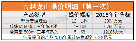 今年3月31日,古越龍山也曾發(fā)布部分產(chǎn)品提價(jià)的公告,公告稱,根據(jù)目前市場情況和公司產(chǎn)品的供求狀況,公司已于 2016 年 3 月 15 日起陸續(xù)上調(diào)部分產(chǎn)品的價(jià)格,具體情況如下: