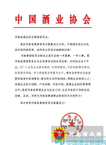值此之際,中國酒業(yè)協(xié)會向河南省酒業(yè)協(xié)會發(fā)來賀電,對河南省黃酒委員會的成立表示祝賀!
