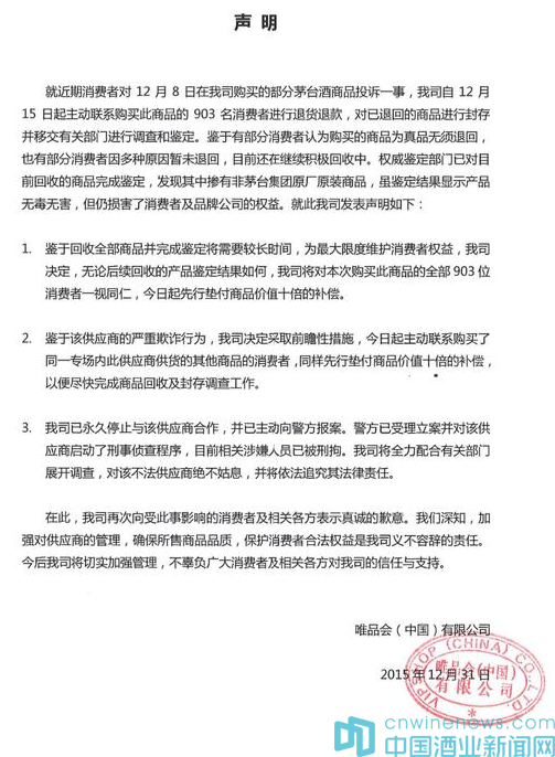 鑒于茅臺酒事件帶來的不良影響,唯品會已暫停所有白酒類商品的銷售,并永久停止與涉事供應商的合作,再次全面復核公司商品采購供應鏈及供應商資質,杜絕此類事件再次發生。致歉函全文如下: