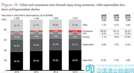 從消費(fèi)渠道看,電商持續(xù)高速增長。報(bào)告稱,過去四年,中國電商市場復(fù)合年增速達(dá)到37%,產(chǎn)生收入近4萬億元,令中國成為全球最大電商市場。