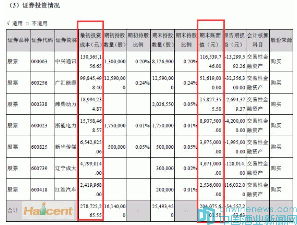 除主營業務啤酒營收下滑12.31%外,蘭州黃河一向熱衷的“炒股”收益也不盡如人意。記者注意到,公司上半年持倉的7只股票,除江淮汽車之外,其余6只全部套牢,累計浮虧金額接近7500萬元。