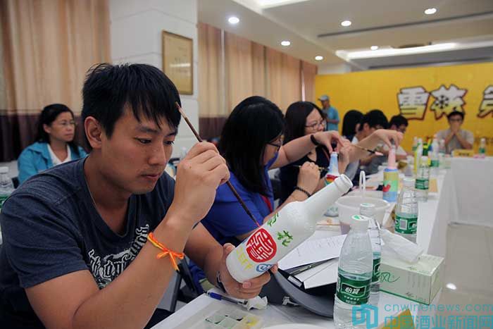 同學們人手一支啤酒瓶,用清水濕潤毛筆后,挑選喜愛顏色的丙烯顏料,一筆一劃地細心勾勒出精致花紋,將各自對雪花啤酒的印象以及對生活的感悟描繪在啤酒瓶上。會堂中不時傳來陣陣歡笑,同學們都樂在其中,紛紛與自己的杰作合影留念。
