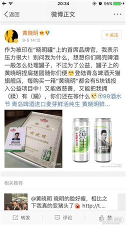 作為被“印”在罐上的青啤全球首席品牌官,黃曉明也發(fā)出了聲音,不僅為銷量,也為了與之相關(guān)的公益項目。他在自己的微博上表示壓力很大,“別問我為什么,想想你們喝完啤酒一般怎么處理罐子,為了公益,罐子上的黃曉明捏扁搓圓隨你們便,登錄青島啤酒天貓旗艦店,每購買一箱‘黃曉明’,都會有5塊錢投入公益項目中,又能做慈善,又能把我擁(蹂)有(躪),你們還等什么?”俏皮的語言下方,附上了自己的聘書和鮮活新裝“曉明罐”的圖片。