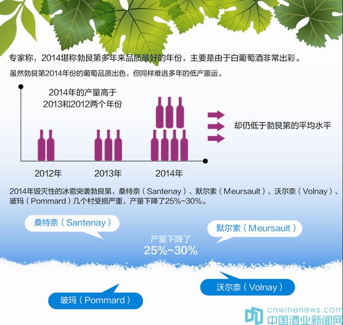 雖然勃艮第2014年份的葡萄品質(zhì)出色,但同樣難逃多年的低產(chǎn)噩運(yùn)。2014年的產(chǎn)量高于2013和2012兩個(gè)年份,卻仍低于勃艮第的平均水平。2014年毀滅性的冰雹突襲勃艮第,桑特奈(Santenay)、默爾索(Meursault)、沃爾奈(Volnay)、玻瑪(Pommard)幾個(gè)村受損嚴(yán)重,產(chǎn)量下降了25%~30%。