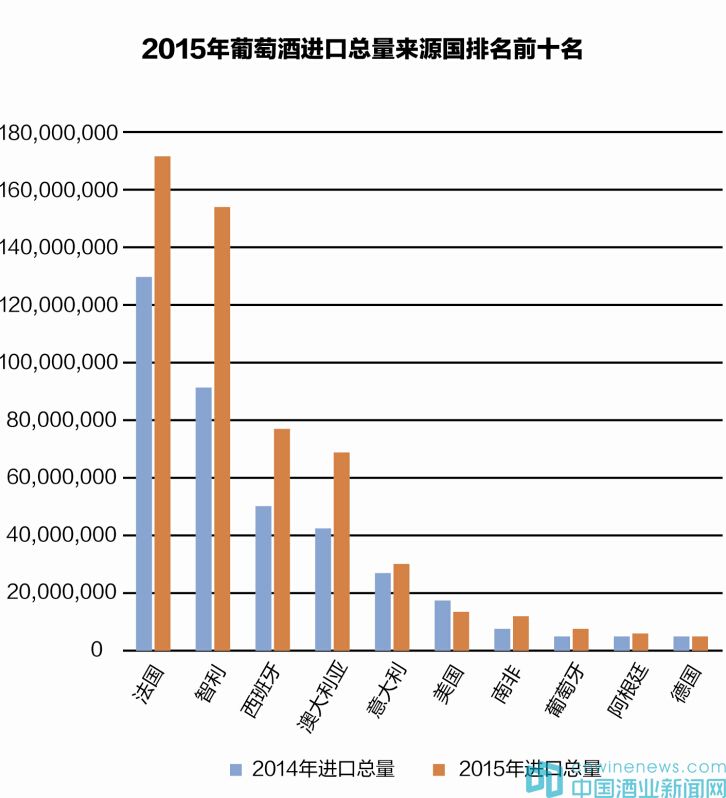 在短短的十年間,智利已經發展成為中國第二大葡萄酒進口來源國。2015年,我國進口的智利葡萄酒達15.4萬千升,距離排在首位的法國(17.1萬千升)僅有一步之遙。其中,從智利進口的散裝葡萄酒約為10.5萬千升(2014年為5.6萬千升)。智利仍為我國最大的進口散裝葡萄酒來源國,占據了大半份額,比排名第二的西班牙高出8.5萬千升。
