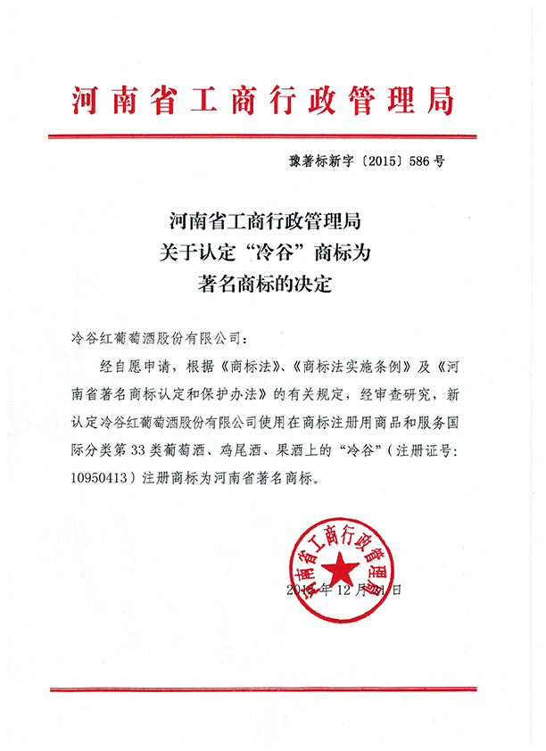 近日,冷谷紅葡萄酒股份有限公司的冷谷注冊商標被認定為河南省著名商標。這一榮譽的取得,使冷谷紅葡萄酒股份有限公司成為商丘市既擁有中國馳名商標又擁有河南省著名商標、而且是數