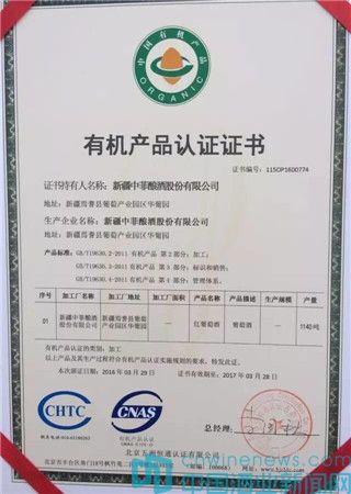 近日,新疆中菲釀酒股份有限公司,獲得由北京五洲恒通認證有限公司頒發的“有機產品認證證書”(證書編號:115OP1600774)。