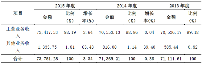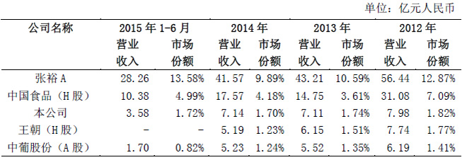 根據(jù)國家統(tǒng)計局?jǐn)?shù)據(jù),2012-2015年我國葡萄酒行業(yè)主營業(yè)務(wù)收入分別為438.46億元、408.17億元、420.57億元和462.64億元,公司營業(yè)收入分別為7.9億元、7.11億元、7.14億元和7.38億元,分別占行業(yè)的1.82%、1.74%、1.70%和1.60%。