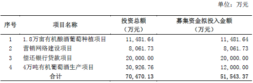 本次募集資金為5.15億元,將用1.8萬畝有機釀酒葡萄種植項目、營銷網(wǎng)絡(luò)建設(shè)項目、償還銀行貸款項目和4萬千升有機葡萄酒生產(chǎn)項目。