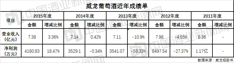 威龍股份招股書顯示,威龍葡萄酒2015年實現(xiàn)營收7.38億元,相比于2014年增長3.36%;凈利潤4180.83萬元,較2014年增長18.47%