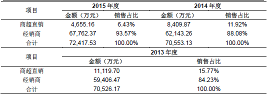 威龍股份在招股書中介紹公司主要的銷售模式為經(jīng)銷商模式和商超直銷模式。電子商務(wù)快速發(fā)展,大型連鎖商超的門店吸引客流的能力受到?jīng)_擊,導(dǎo)致大型連鎖商超在葡萄酒行業(yè)銷售渠道中的地位受到一定影響。2013年、2014年和2015年來自商超直銷模式的售收入為1.11億元、8409.87萬元和 4655.16萬元,占公司主營業(yè)務(wù)收入的比例為15.77%、11.92%和6.43%,收入和占比持續(xù)下降。報告期內(nèi),公司對商超渠道進(jìn)行了優(yōu)化調(diào)整,同時通過加強與經(jīng)銷商的合作,加大對區(qū)域各類售終端渠道的覆蓋,以降低商超銷售下降對公司影響。