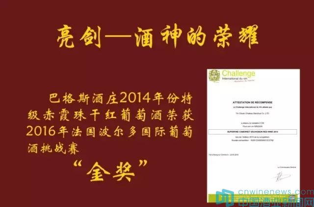 2016年4月25日,銀川巴格斯葡萄酒莊收到了來自葡萄酒圣地----法國波爾多的喜訊:巴格斯酒莊2014年份特級赤霞珠干紅葡萄酒榮獲了2016年法國波爾多國際葡萄酒挑戰賽-“金獎”。