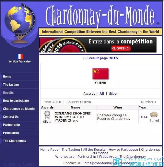 中菲酒莊2014霞多麗干白葡萄酒成為本次大賽唯一獲獎中國葡萄酒