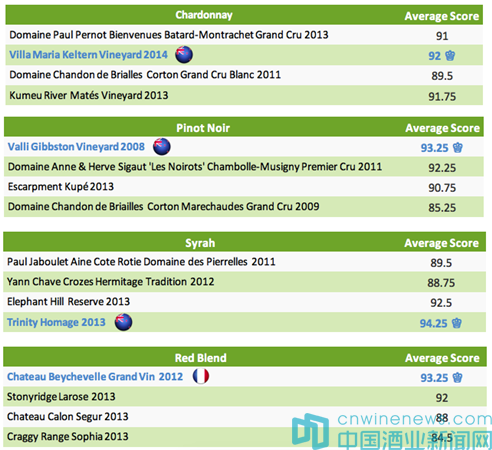 本次的大師班用酒共分為4組,每組由兩只新西蘭頂級葡萄酒,以及兩款法國名莊佳釀組成。四組用酒的主題分別是:霞多麗、黑皮諾、西拉,以及紅葡萄酒混釀。詳細酒單及現場評委評分如下: