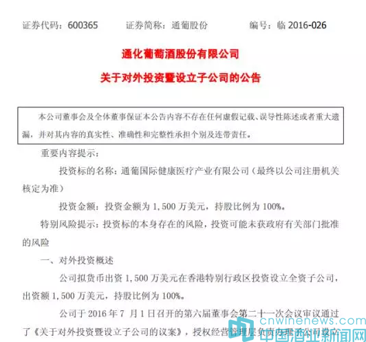 據通葡股份于7月2日發布的《通化葡萄酒股份有限公司關于對外投資暨設立子公司的公告 》顯示,通葡股份擬設立通葡國際健康醫療產業有限公司(以下簡稱“香港子公司”), 通過參與專業醫療投資基金或直接股權投資等方式投資香港當地專業醫療機構。 香港子公司主要定位于從事醫療產業投資和健康產業投資。公司現擬通過香港子公司投資的標的公司是一家主要從事投資全球再生醫學產品的研發和商業化,以及優質醫院和醫療中心的專業醫療投資集團,其醫療產品和醫療服務內容主要包括:干細胞專利技術和治療產品,國際醫療、在線會診、生物醫學檢測和健康體檢,以及再生醫學抗衰老產品等。