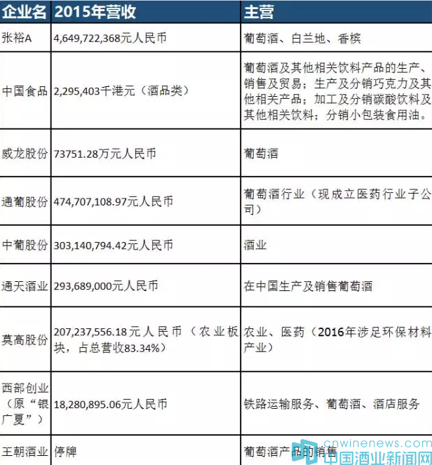 事實的確如此。以上市企業(含港股)為例,銷售額排名第一位的張裕,其2015年營收達到46.49億元人民幣,是排名第二的中國食品酒類業績近1.5倍(中國食品酒類板塊2015年營收為22.95億港元)。而排名靠后、多元化發展的莫高股份農業板塊為2.07億元人民幣,西部創業(原“銀廣夏”)為1828萬元人民幣。張裕是前者的20倍,后者的254倍。前述欲進入醫藥行業的通葡股份,其2015年營收為4.74億元人民幣,也僅占張裕同期業績10%左右。