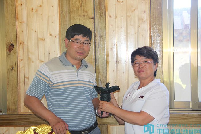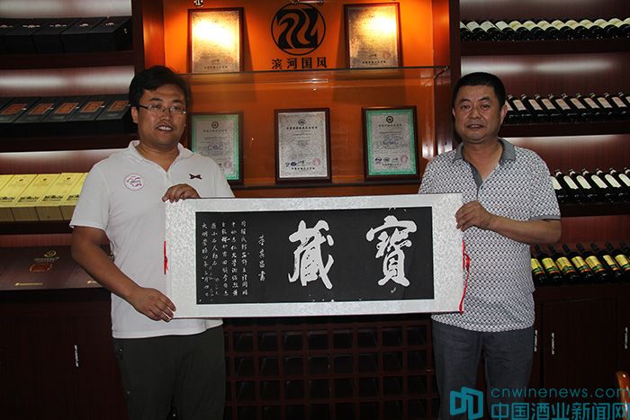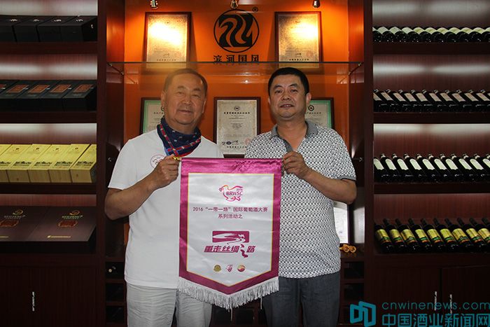 15日,由著名葡萄酒專家郭松泉、國家一級品酒師、著名葡萄酒專家張春婭領隊的“重走絲綢之路”一行,抵達張掖國風酒業。郭松泉向國風酒業贈送了“重走絲綢之路”的紀念版錦旗,北京市房山區葡萄種植及葡萄酒產業促進中心主任助理孟令奎和北京國際酒類交易所金融部副總赫崢則代表2016“一帶一路”國際葡萄酒大賽執委會,向國風酒業贈送了明朝書畫家董其昌書寫的“寶藏”拓本,并對其闡述活動舉行的情況。