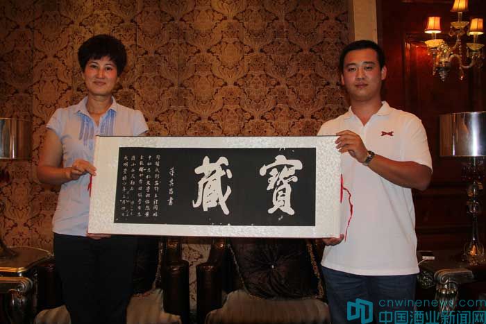 郭松泉向新疆酒局贈送了《新中國葡萄酒業(yè)五十年》和《國際葡萄釀酒法規(guī)》等書籍,北京市房山區(qū)葡萄種植及葡萄酒產(chǎn)業(yè)促進中心主任助理高宏超和北京國際酒類交易所金融部副總赫崢,代表BRWSC組委會向安紅贈送重走絲路活動紀念版錦旗及董其昌手書的“寶藏”拓本,并對其講述大賽舉行精神。