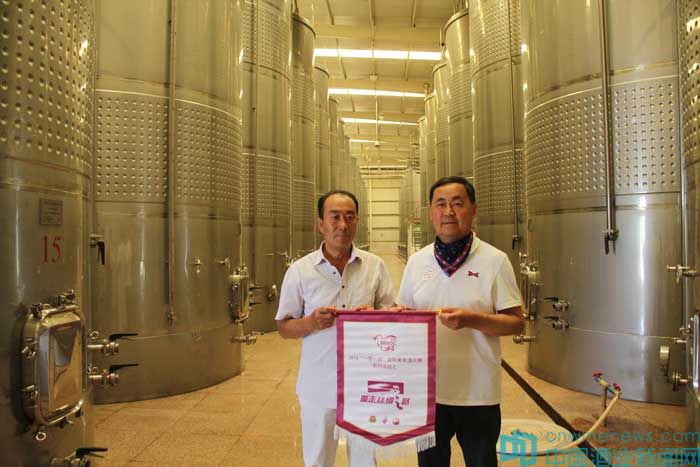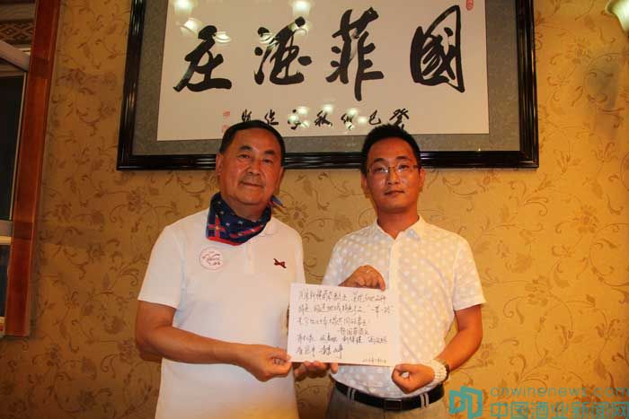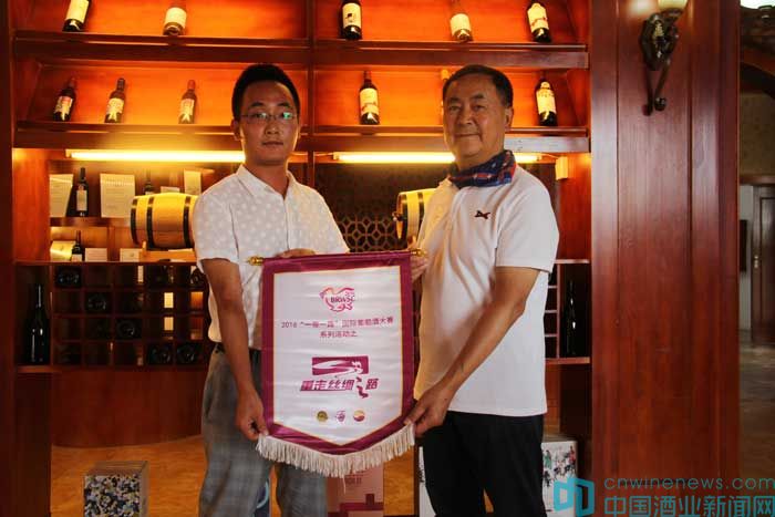 北京市房山區葡萄種植及葡萄酒產業促進中心高宏超和北京國際酒類交易所金融部副總赫崢代表BRWSC組委會,向冠龍公司和國菲酒莊贈送了重走絲路活動錦旗及董其昌手書的“寶藏”拓本。