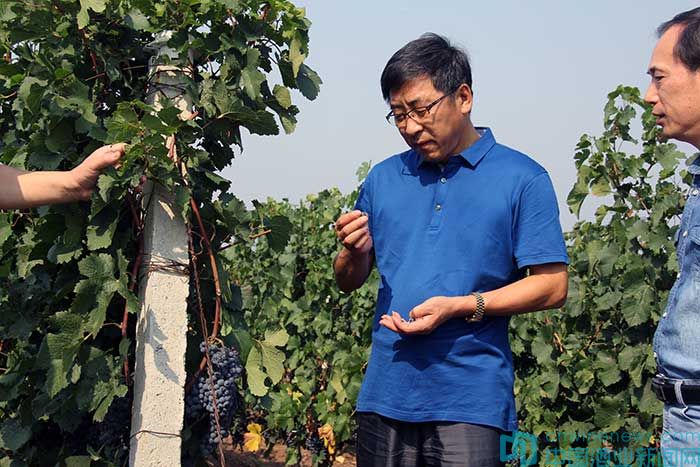 剛進酒莊,采訪團一行人便被酒莊工作人員帶進了葡萄園,據介紹,金鼎酒莊遵循國際葡萄酒莊3S原則,栽培了赤霞珠、美樂、蛇龍珠等多種品種,建成了1000畝釀酒葡萄基地,為酒莊釀酒提供了充足又優質的原材料。