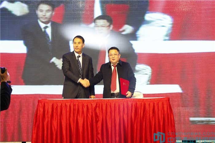 山東溫和酒業(yè)集團(tuán)韓東董事長(zhǎng)與山東省臨沂市總商會(huì)副會(huì)長(zhǎng)兼臨沂市工商聯(lián)糖酒食品總會(huì)會(huì)長(zhǎng)劉廣寶同志簽署溫和酒戰(zhàn)略合作合同書
