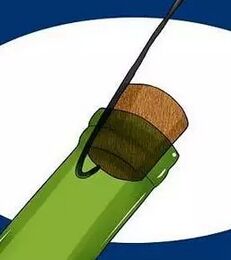 Bingo....一根鋼絲行不行,No problem,需要注意的還是要干凈的??!將一小節(jié)細(xì)鋼絲折個(gè)掛鉤貼著瓶口內(nèi)壁與木塞中間緩慢伸入瓶中,旋轉(zhuǎn)掛鉤并鉤住木塞,慢慢將木塞拔出,還是要注意安全噢。