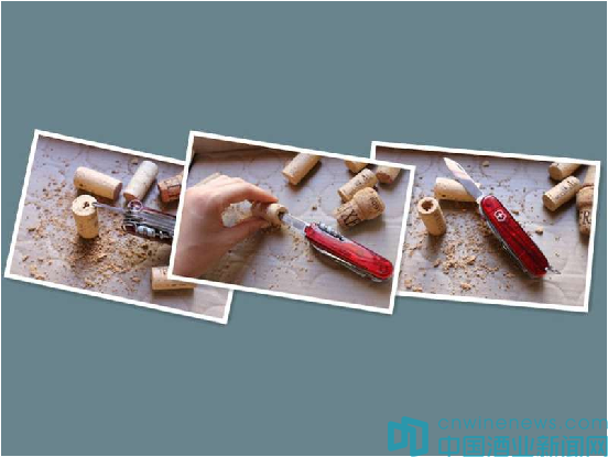 2. 接著用瑞士軍刀中的矬子(或是其它尖銳金屬)在橡木塞上打一個小孔,再用小刀把橡木塞中的木屑剔除,使之形成一個具有一定深度的中空結構。