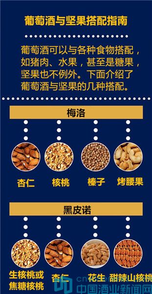 什么?花生、開心果也能搭配葡萄酒啦?沒錯,與食物幾乎百搭的葡萄酒也可以和堅果搭配哦。下面這張圖就介紹了幾種葡萄酒與堅果的搭配。