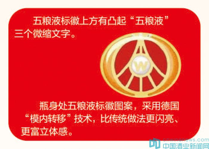 除了防偽標(biāo)識,商標(biāo)也是辨別酒的真?zhèn)蔚囊粋€(gè)直觀方法。以醒目的“五糧液”三個(gè)大字作為特殊標(biāo)志,商標(biāo)圖案底部用黃色谷穗襯映,谷穗以上全部套紅,“五糧液”三個(gè)字是谷穗圖形略凸起,商標(biāo)背面印有出廠日期,透過酒液和瓶體就能看清楚。