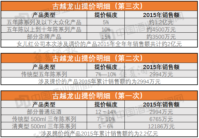 在會稽山之前,古越龍山曾分別在3月31日、5月5日和5月23日連續三次宣布部分產品漲價,漲價明細如下: