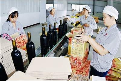 5月25日,在羅城仫佬族自治縣中天酒莊生產車間,工人正在忙著包裝葡萄酒。