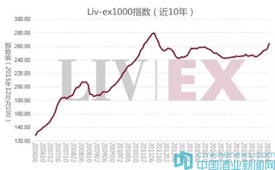 Liv-ex 1000指數(shù)上次達(dá)到較高水平是在2011年9月,當(dāng)時(shí)指數(shù)收于266.9點(diǎn)。2011年7月,該指數(shù)達(dá)到峰值279.7。