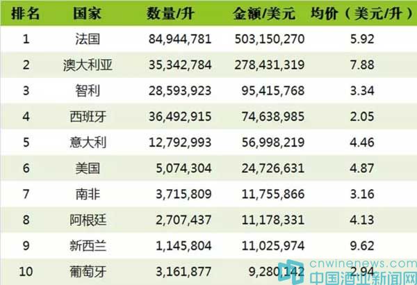 從瓶裝葡萄酒均價來看,排在前 5 位的分別是:新西蘭(9.62 美元/升)、澳大利亞(7.88 美元/升)、法國(5.92 美元/升)、美國(4.87 美元/升)和意大利(4.46 美元/升)。