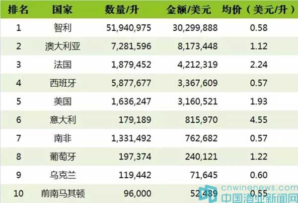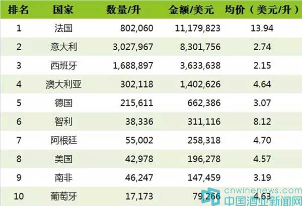 在進口瓶裝葡萄酒來源國中,西班牙的均價最低,為 2.05 美元/升,在散裝葡萄酒來源國中,其均價也較低,為 0.57 美元/升,這說明西班牙葡萄酒有極大的價格優勢。