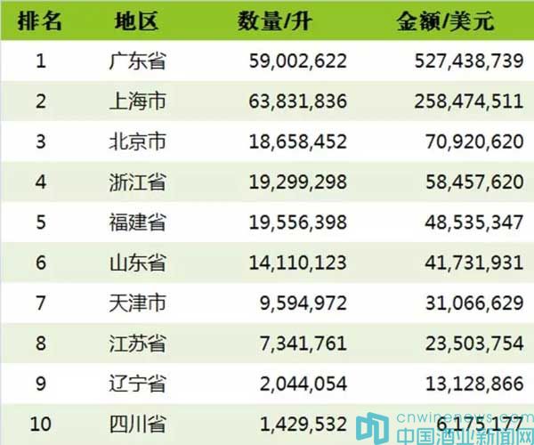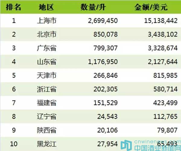 進口葡萄酒貿易地區仍舊集中在北上廣等沿海一線城市,山東消費散裝酒最多(其消費起泡酒的幅度明顯增長),廣東消費瓶裝酒最多,而上海消費起泡酒最多。這些城市消費水平相對較高,對葡萄酒認知相對更深,跟容易接受不同價格范圍的葡萄酒。此外,葡萄酒在內陸的消費也有所增長,比如陜西、新疆等內陸城市也出現在了消費地區排行榜上。