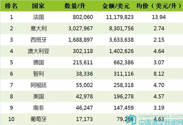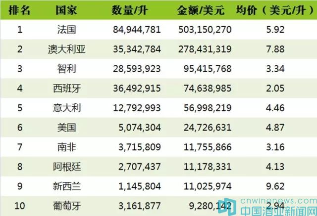 5、從瓶裝葡萄酒均價來看,排在前5位的分別是:新西蘭(9.62美元/升)、澳大利亞(7.88美元/升)、法國(5.92美元/升)、美國(4.87美元/升)和意大利(4.46美元/升)。