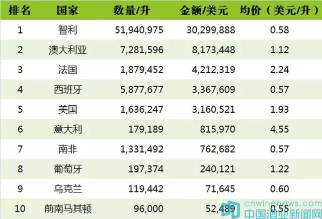 總的來說,排名與2015上半年相比有一些變化,去年排在最后兩位的是加拿大和德國,今年取而代之的是烏克蘭和前南馬其頓,國人所消費散裝葡萄酒的來源也國越來越廣。不過,無論從進口量還是進口額上,智利都遙遙領先,分別占到73.5%和59%的份額。不過其均價為0.58美元/升,低于各國的平均價1.39美元/升。