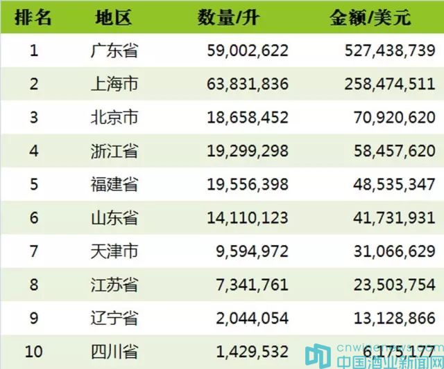 2、10大進口散裝葡萄酒貿易地區