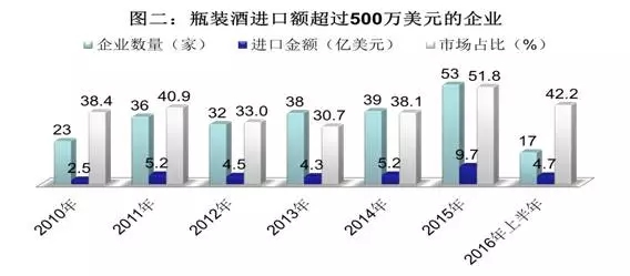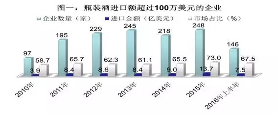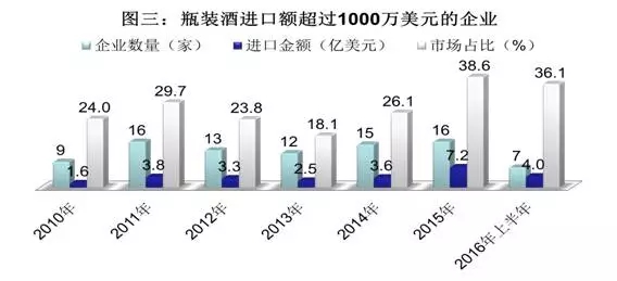 從上述三圖中可以看出,2010年-2016年上半年期間,三級劃分標準下,企業數量、進口金額及市場占比等三項指標數據整體呈上升趨勢,顯示我國進口瓶裝酒市場集中度在逐步提高,進口瓶裝酒市場已進入中高度競爭階段。考慮到我國進口瓶裝酒市場的巨大潛力和穩定的增長態勢,我們認為進口瓶裝酒行業集中度未來還將進一步提升。