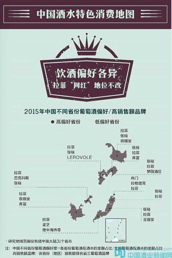 有意思的是,在中國品酒省份地圖中,在不同酒類消費者的認知偏好均大有不同。在葡萄酒的選擇上消費者最講究。拉菲作為最知名葡萄酒的品牌之一,在中國各地區都很受歡迎,接受更多西方文化的上海、廣東等地,最愛法國原裝葡萄酒;在白酒的選擇上,消費者對當地品牌偏好更高,如內蒙的“蒙古王”、山西的“汾酒”“杏花村”、西北地區的“北國風光”等,都在當地銷售火熱。其他地區則主要以茅臺,五糧液為主。啤酒與各地的飲食偏好密切相關,黑龍江大漢飲酒豪氣名副其實,最喜歡濃郁味苦的卡力特黑啤;南方地區口味則比較清淡,喜歡清爽的青島啤酒和醇厚甘爽的奧丁格;上海人喜歡加檸檬片喝科羅娜啤酒,可見海派生活的講究。浙江紹興的黃酒聞名于全國,唐宋、古越龍山、女兒紅、安昌太和、塔牌等消費者喜愛的黃酒品牌均出自浙江紹興市。有意思的是,浙江消費者也最會享用黃酒,往往喜歡購買陽澄湖大閘蟹配黃酒。