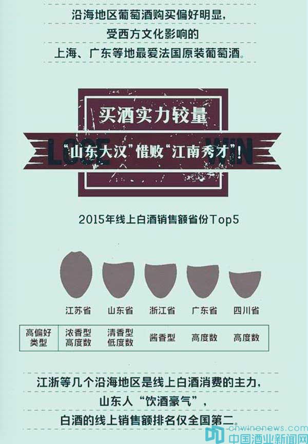 目前,葡萄酒和白酒是線上酒類銷售最主要的兩個品類,其次是啤酒和洋酒。從不同類別看,山東出產的國產葡萄酒最受國人歡迎;濃香型白酒銷售額占到白酒整體銷售額近一半;啤酒的消費金額和比例逐年加大的趨勢明顯,“小眾”精釀啤酒受高端用戶追捧。