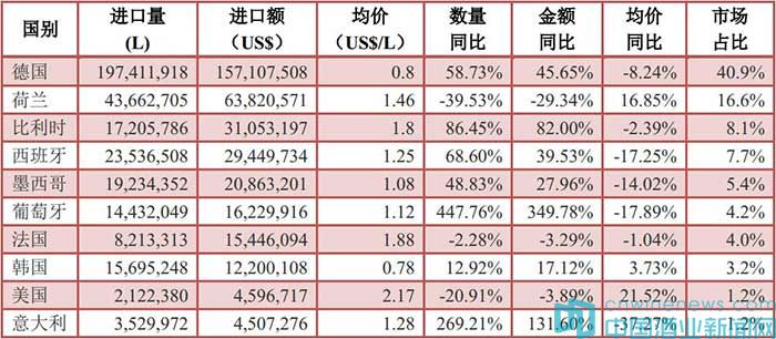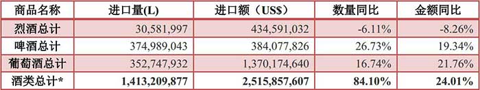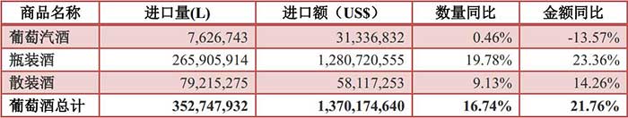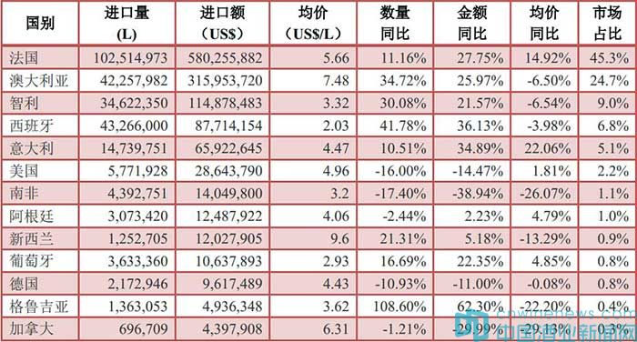 除了葡萄汽酒繼續下降以外,瓶裝酒和散裝酒均表現平穩,其中瓶裝酒進口額同比增長了23.7%,占葡萄酒進口總額的93.5%,進口瓶裝酒市場繼續向好。